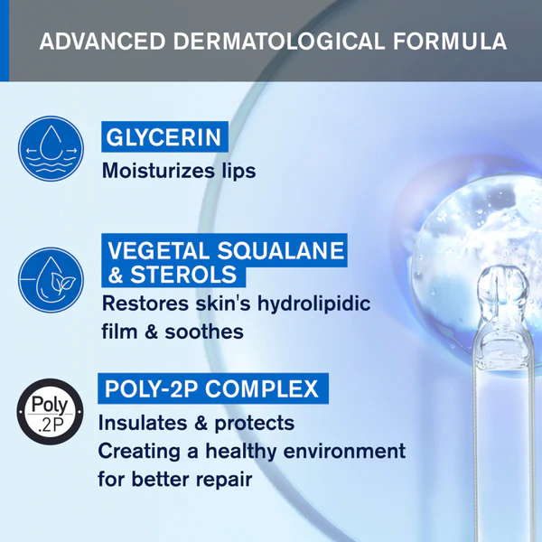 The combination of two polymers repairs chapped and damaged lips.